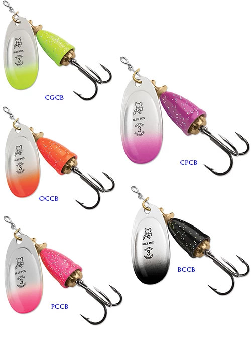 The Classic Vibrax® gets a tasty candyback! Colored bell is accented with metallic flecks. Blade is tipped in matching color, while blade back is finished with transparent, fluorescent coordinating color. Flaw-free silver plating, fine tolerances and super-sharp hooks are long-standing features of this low frequency emitting patented two-part body spinner.