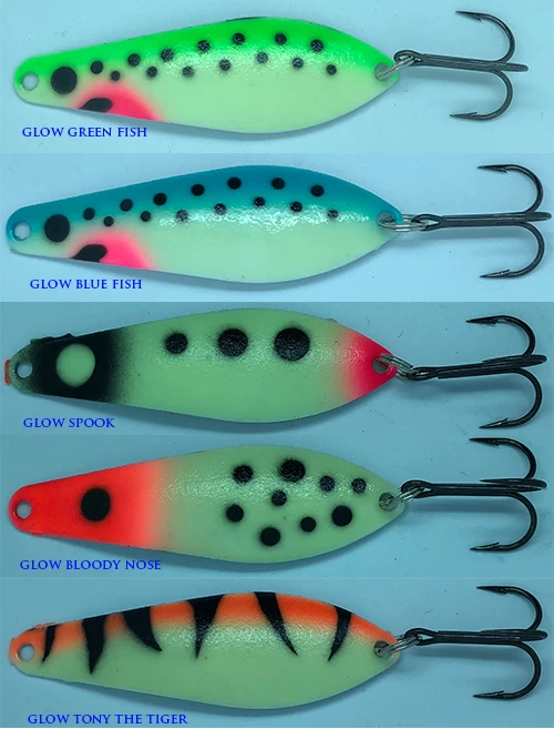 3-1/4″ length glow with white back trolling spoons made in Duluth, MN